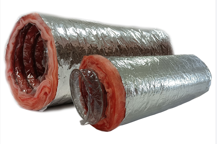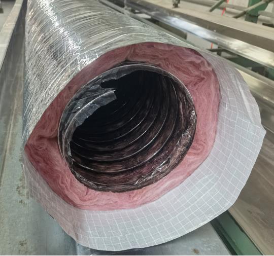 大家可以看到他的內(nèi)管是帶有黑色的pet軟管,中間是粉紅色的玻璃棉,外套就是我常見的鋁箔外套,當(dāng)然也有夾筋鋁箔外套。